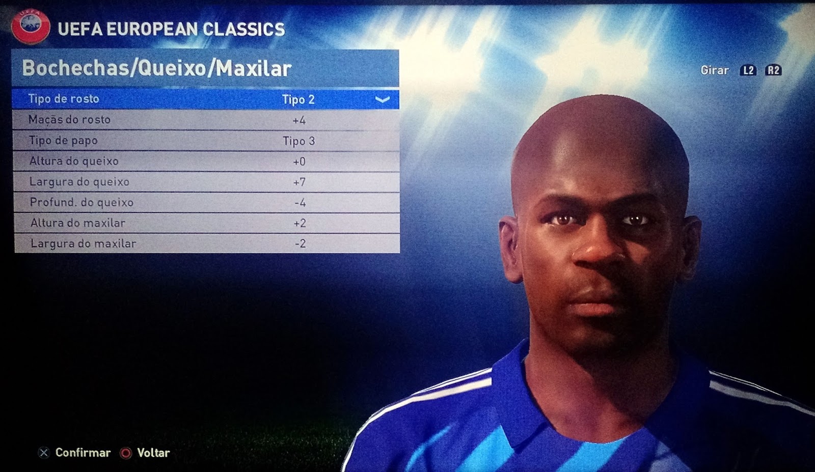 VÁ EM MENU EDITAR >JOGADORES>EDITAR JOGADOR>TIMES CLÁSSICOS>UEFA EUROPEAN CLASSIC>ENTRE NO PRÓXIMO JOGADOR A EDITAR FACE >APARÊNCIA